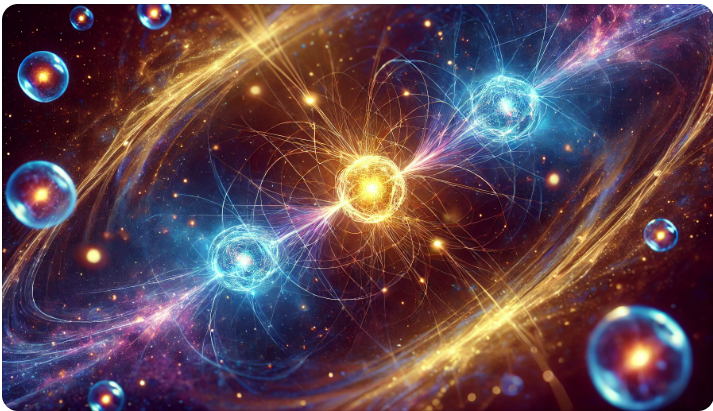 양자 얽힘과 비국소성을 표현한 이미지입니다. 두 입자가 연결된 모습과 우주적 배경이 비국소성의 신비로움을 강조하며, 과학적 개념을 시각적으로 쉽게 이해할 수 있습니다.